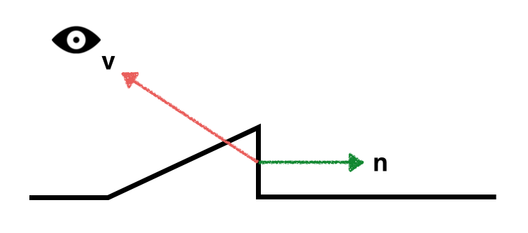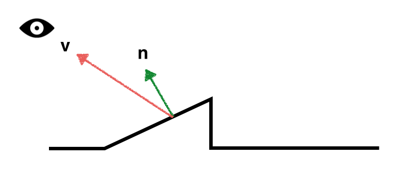 To create your rim shader, first a bit of background about the vectors that we need to perform the calculations. The contribution of the rim shading should be bigger around the peaks. Around the peaks, some normals are pointing towards the eye/cam position and some are pointing away. In the image below you can see that the angle between the normal and the eye vector (v) is big.