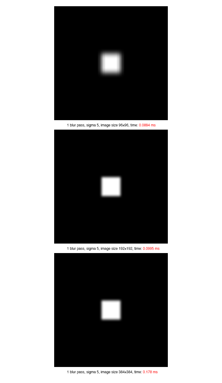 Another trivial way to speed up the blur process is to simply reduce the size of the texture that you want to blur. In the images below I've used several different sizes and blur steps. when you reduce the size of the input texture for the blur you'll see that the quality is a lot less. Though this can be easily fixed by applying a couple more blur passes. You have to find the best mix between scale and the number of blur passes you want to do.