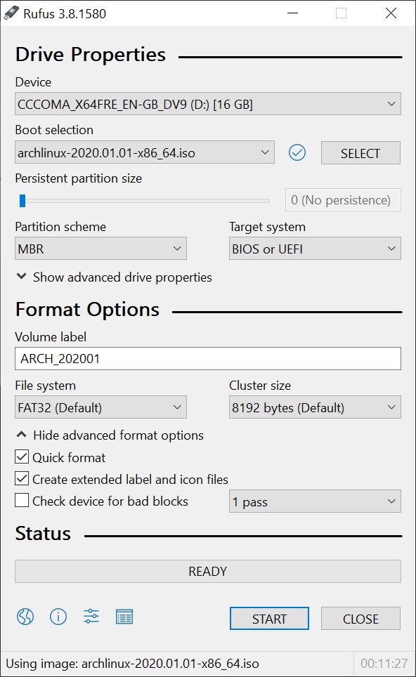 - Boot selection: press the SELECT button and brofwse to your arch iso file.
